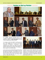 Governance, Transparency and Service to Members & Students www.icap.org.pk Seminar on Start-up Pakistan The Southern Regional Committee (SRC) of the Institute of Chartered Accountants of Pakistan (ICAP) organised a seminar on Start-up Pakistan on January 13, 2017 at ICAP House, Clifton, Karachi. The program commenced with the opening remarks and a brief background of the topic by Adil Iqbal, Continuing Professional Development (CPD) consultant SRC, followed by which the keynote speaker, Nadeem Hussain, coach, Planet N Group was invited to deliver his presentation on Challenges in the Eco System of Entrepreneurship. A panel discussion on Digital Pakistan followed after Followed by the panel discussion, the session the keynote presentation. The panellists were Arif chairman, Salim Raza was invited on stage to distribute Sirhindi, group executive, Payment Services Group, mementos to the speaker and panellists as a gesture UBL, Yassir Pasha, CEO, Tapmad TV Pakistan, Salman of appreciation. To conclude the program, Abdul Rab, Hassan, CEO, Yayvo.com and Salim Raza, former chairman SRC thanked the speaker and participants governor, State Bank of Pakistan. and invited them for hi-tea. February 2017 5